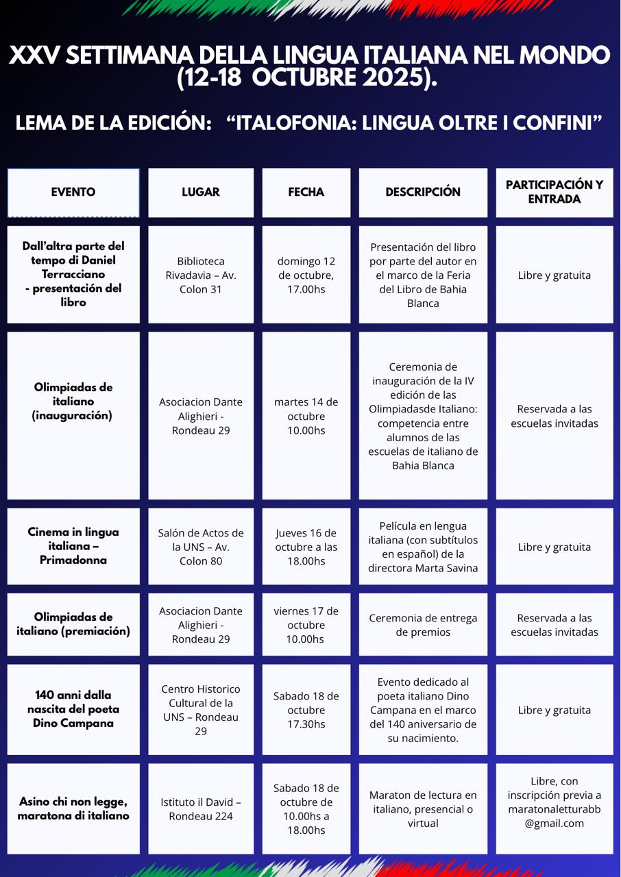 En Bahia Blanca el Consulado General organiza, en colaboración con distintas instituciones públicas y privadas de la ciudad, un conjunto de eventos gratuitos en el periodo 12 – 18 de octubre 2025.